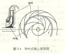 2)導(dǎo)葉式泵——在葉輪外圍安有幾個(gè)固定導(dǎo)葉片的泵即為導(dǎo)葉式泵(圖2-4)。在早期,這種泵叫透